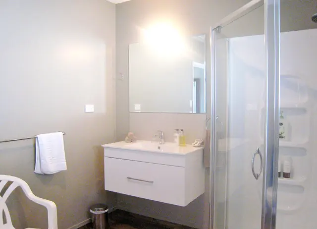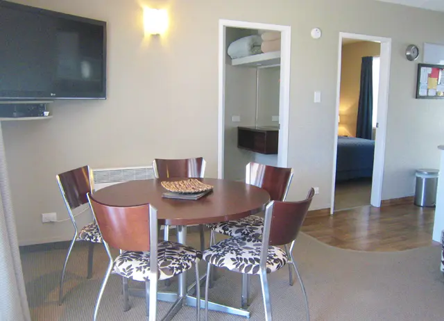 Beautifully renovated two bedroom unit with disabled access. This is our front unit, nearest the road, but dont be put off, it has double glazing and is very quiet at night. King bed in first bedroom, Double and Single in the second bedroom and fold-out slatted sofabed in the lounge. Free broadband wifi available. Spacious lounge/dining area has 42LCD TV, Guest Select Sky and DVD player with a second TV and DVD player in the main bedroom. A choice of quality teas and coffees, including plunger coffee. Lovely, spacious new wet floor shower room with fold down seat, quality amenities, heating and heated towel rail . Kitchen has ceramic hob, microwave oven and electric frypan. This apartment does not open onto the deck, access is at the kitchen door where there is undercover parking. Breakfast service, Undercover parking.