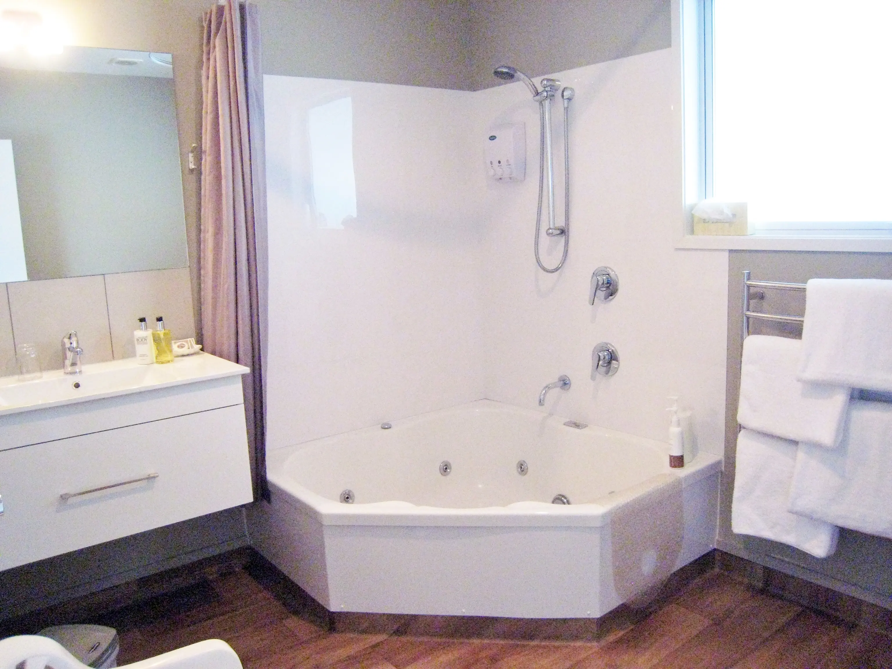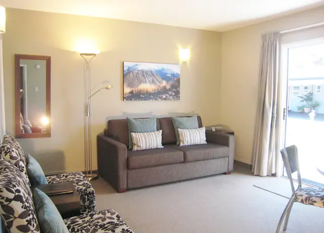 Beautifully renovated two bedroom unit with King bed in first bedroom, Double and Single in the second bedroom and fold-out slatted sofabed in lounge. Free broadband wifi available. Spacious lounge/dining area opening onto deck patio. 42LCD TV, Guest Select Sky and DVD player with a second TV and DVD player in the main bedroom. A choice of quality teas and coffees, including plunger coffee. Lovely, spacious corner spa (shower over) in the bathroom, with quality amenities, heating and heated towel rail . Kitchen has ceramic hob, microwave oven and electric frypan. Breakfast service, undercover parking.